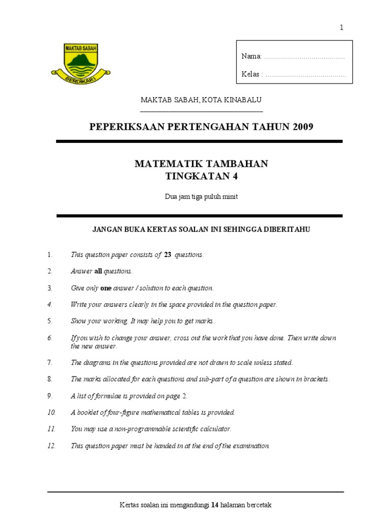 Formula list below is the formula list that will be given during examination. Calon yang tidak dapat menduduki mana-mana kertas peperiksaan bertulis atau melaksanakan ujian lisan khusus. Soalan matematik tingkatan 4 peperiksaan pertengahan tahun matematik tingkatan 4 contoh soalan.